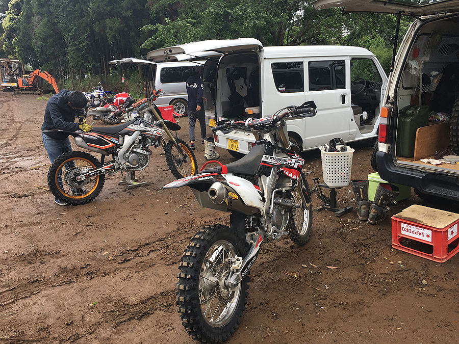 前々回からサスのセッティングを始めたCRF250R(X)“モルゲンシュテルン号”ですが、ずっと好天でのセッティングでした。まぁ、標準値を出すという意味で、好天時である必要もあったのですが、今回は土曜日に目一杯雨が降ってくれたお陰で、ニュルニュルの成田モトクロスパーク(のエンデューロコース)での練習となりました。