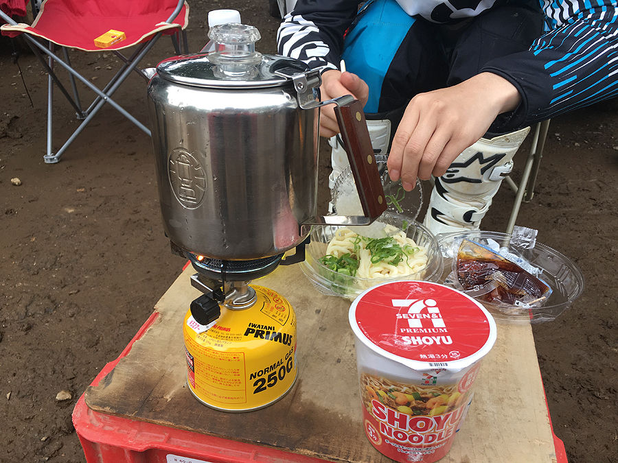 今日は道路挟んだ初級コースの方は、何かのイベントで大勢が集まってましたが、奥のパドックにはあまり人が居らず、転けようがひっくり返ろうが、あまり迷惑にならない感じでした(その代わり、誰も助けに来ないw)。とはいえ、見るからに滑りそうな路面ですし、午後から晴れるという予報でもあったので、なんとなく全員ダラダラしてしまってなかなか走り出さない。自分も前回の榛名で真っ黒になったエアフィルターを交換して、チェーンに油やって、タイヤの空気圧を前後0.3に落としたあと、アホ話しばっかりしてる。自分らより上手い人らがガシガシ走って、地面耕してくれるのを待ってる感じですw しかし、全然天気は良くならないし、それどころかずっと小雨降ってるし、このままでは埒があかないので、取りあえず試走に行きました。