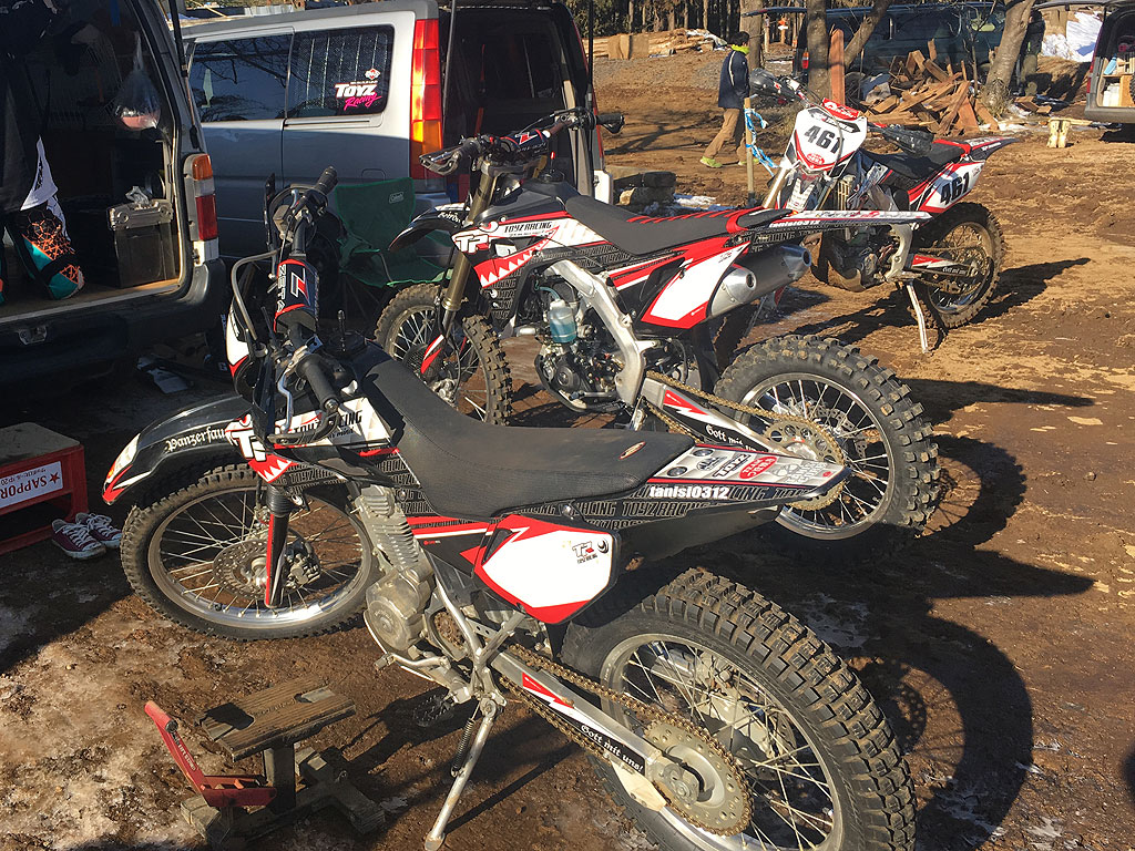 ともあれ、ED本コースに入ってみたのですが、確かに地面硬くて走り易い。ただし、2コーナーの下り坂は雪が若干残って固まっているので、スタンディングで降りて行くのはちょっと怖い気がして、シッティングで降りて行ってみました。が、これが意外と楽。前回だったら、結構腕が前に押される感じがしてしんどかったと思うのですが、そんな感じがあまりしません。わずか10mmシートを削っただけで、ポジションが変わった様です。そのまま大坂をアクセル開けて突破。雪の残るコースを下見かねがねゆっくり走っていたら、何でもないコーナーでクラッチ切りきれなくてエンストして、ごろんと転倒。ワダチが出来てるところは、溶けた雪がうっすら凍ってて、深さが分かり難かったのです、ワダチの山に足を付きながら突破。これもシートが気持ち低くなったお陰で、安心感が倍増しました。