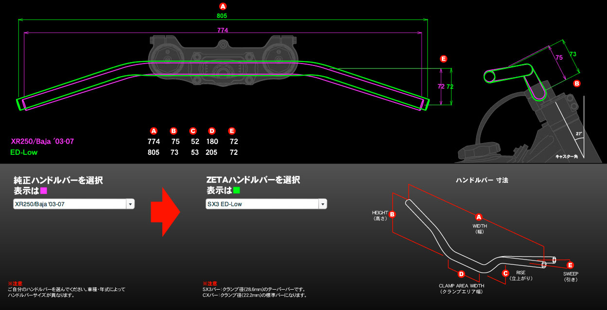 XR250に対応するZETAのハンドルとしては、CXバーやCOMPバーのDual Sport-Lowがありますが、これらは細い標準径です。ファットバーとしては、SOLIDバーがありますが、4種類あるどれもがXR250やED-Lowとは似ても似つかぬ寸法になっています。