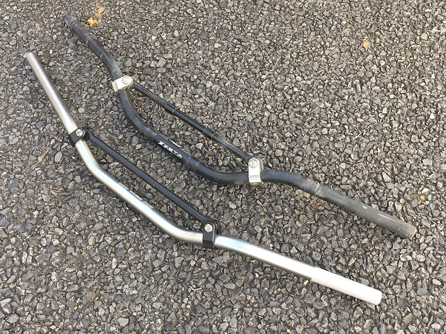 ご覧の通り、ここまでベストテクバーおよびSX3 ED-Lowで最適化してきたのに、そのED-Lowが製造終了という事になり、これは非常に困った事になりました。やはり一番使い慣れたものが良い訳ですし、なにせハンドルは操作する上で一番意識が行く所でもあります。ちなみに、CRF250R(X)はCRF450RXに乗り換えたあと、他の人に譲り、その人に合わせたハンドルに交換されたのですが、それに乗ってみると、腕や肩が疲れ易くなっていました。自分のとは違うポジションになっているので当然なのですが、ハンドルが違うという事は、こういう事なのです。そこで改めて、ハンドルについて考えてみました。SX3 ED-Lowを基準として、これまで乗ったバイク、XR250、CRF250R、XR230のハンドルを比較してみると、