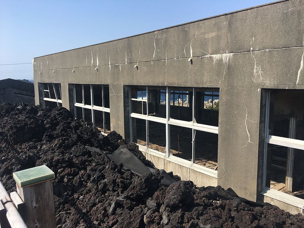 溶岩を堰き止めた阿古小中学校跡