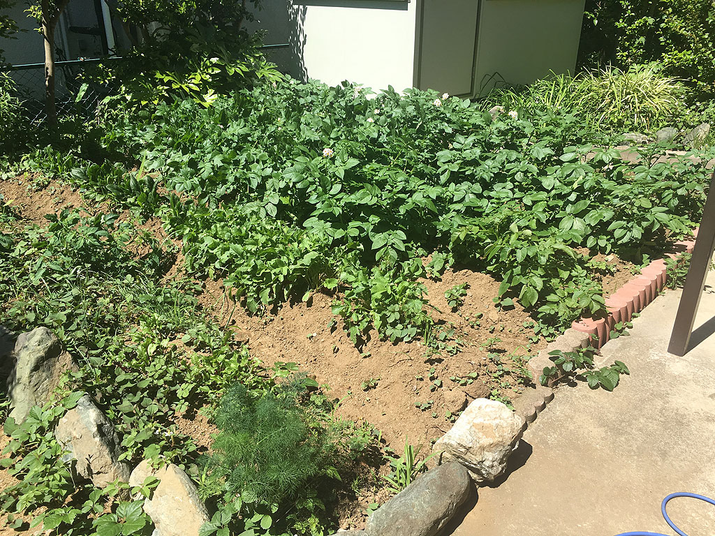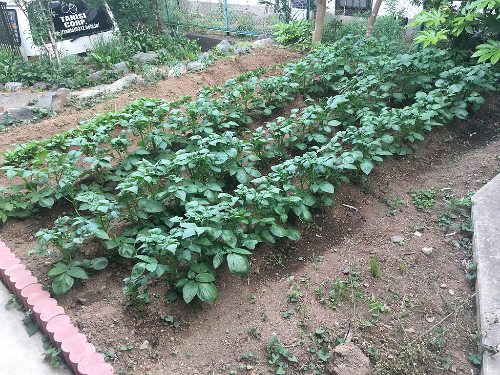 GW中は嫁さんの実家の方で蜂窩織炎という病気になってしまい、3週間ほど家に帰る事が出来ませんでした。その間、猫の面倒を見に来てくれていた嫁さんの伯父さんが畑の方も面倒みてくれていました。自分がいない間に、ジャガイモは花をつけていました。花がついたら、また追肥せねばならないという事で、伯父さんが肥料をあげてくれていました。お陰で、帰った時には、花も葉も爛漫な状態になっていました。あとは花が落ちて、葉が枯れ出したら収穫時期です。