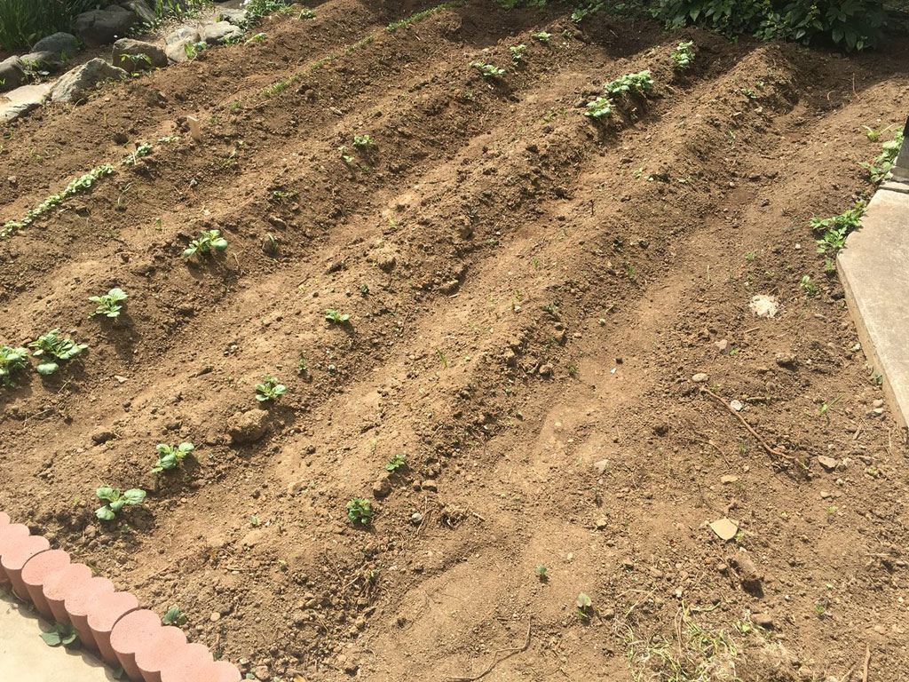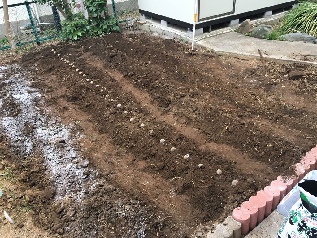という事で、やっとこさ、ジャガイモを植える事になりました。品種は、男爵とキタアカリ。まずは畑に石灰を撒いて中和させ、三条の畝を作って肥料をまき、種芋を輪切りにして断面に石灰をつけて、断面を地面にむけて15cm間隔くらいに植え、土を盛りました。