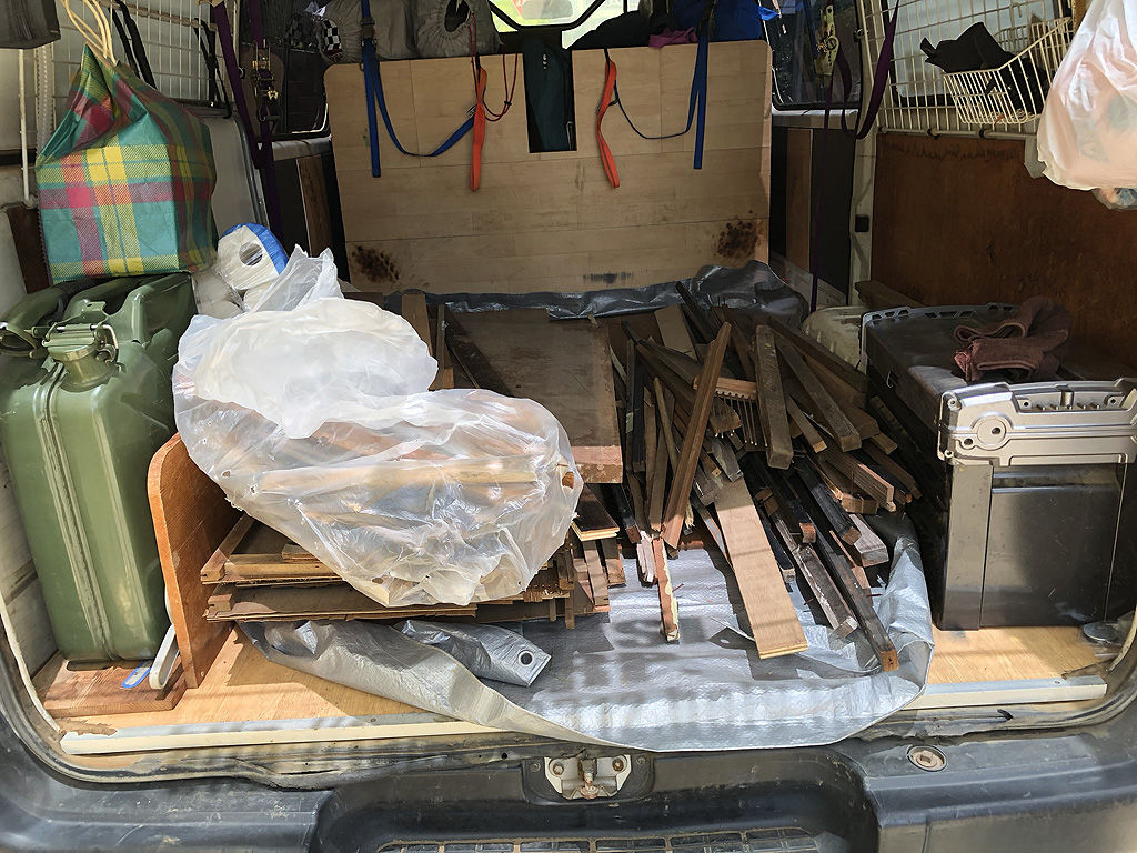 という訳で、生木で飯を炊くのが目的ではないので、どうにか廃材を手に入れる方法を探しました。そこで、地元系掲示板を見てみると、意外にも廃材を出している人がいるもので、しかもラッキーな事にウチの近所でも出している人がいたので、早速連絡を取って貰い受けてきました。聞いたところによると、自分以外にも貰いに来た人がいるそうで、その人はドラム缶風呂に使うとか言ってたとか。上には上がいるもんだと感心しました。ただ、めぼしい廃材はその人が持って行ってしまったみたいで、残っていたのは天井板とか襖や障子の木枠とか、そうした細々したものでした。それでも廃材には違いないので、有り難く頂戴して帰りました。