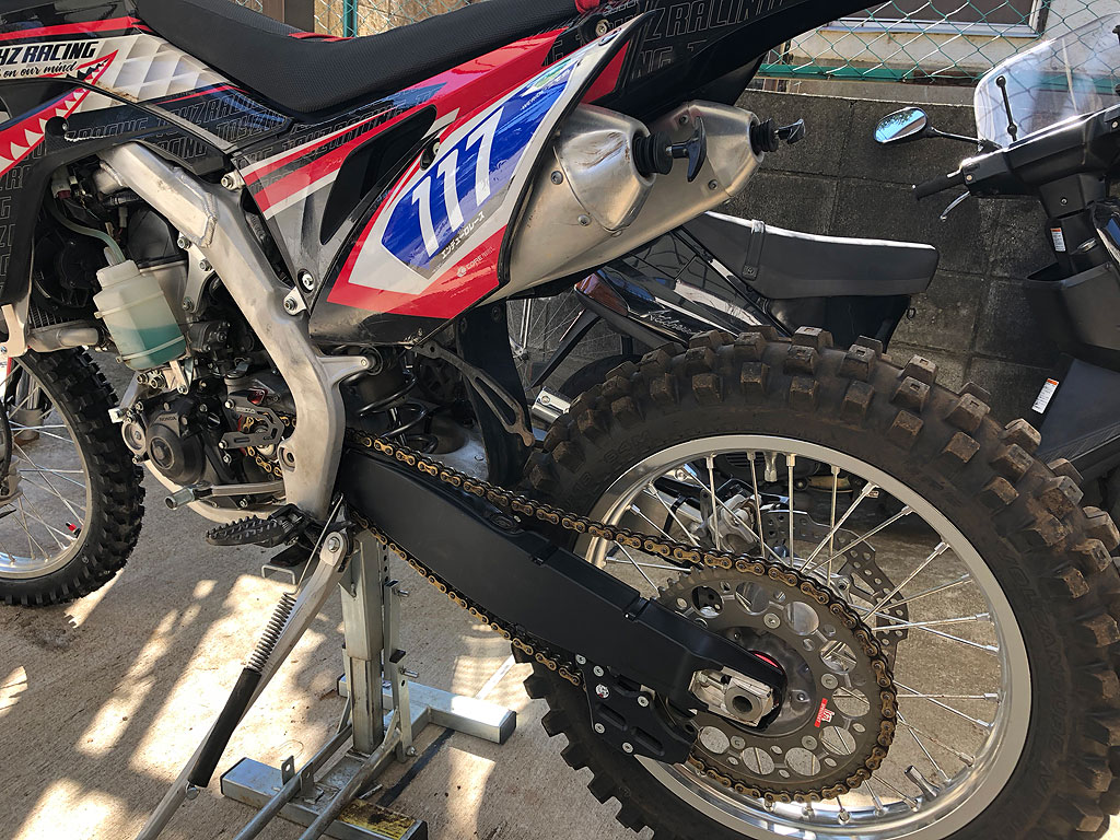 2月に視察旅行に行った時も感じたのですが、三宅島エンデューロのコースは、火山岩の砕けたのがゴロゴロしてて、砂も火山岩を粉砕したやつがザラザラある感じでした。つまり、結構傷だらけになりそうな感じです。なので通常の装甲装備の他に、出来るだけ傷が入らない装備も追加する事にしました。ZETAのフォークラップは、装甲を施した時に用意したのですが、これも三宅島エンデューロを意識して購入したものでした。今回は新たに、ポリスポーツのスイングアームプロテクターを装着。足回りでむき出しになっているのはスイングアームだけなので、そこを保護しました。また、マディー時に装備するダートスキンのフォークシールスキンを装着。これはフォークのスライドパイプを保護するためです。エンジンのクラッチとイグニッションのカバーも注文したのですが、運が悪いとそこが破損するというのに気がつくのが遅すぎて、本番までには間に合いませんでした。
