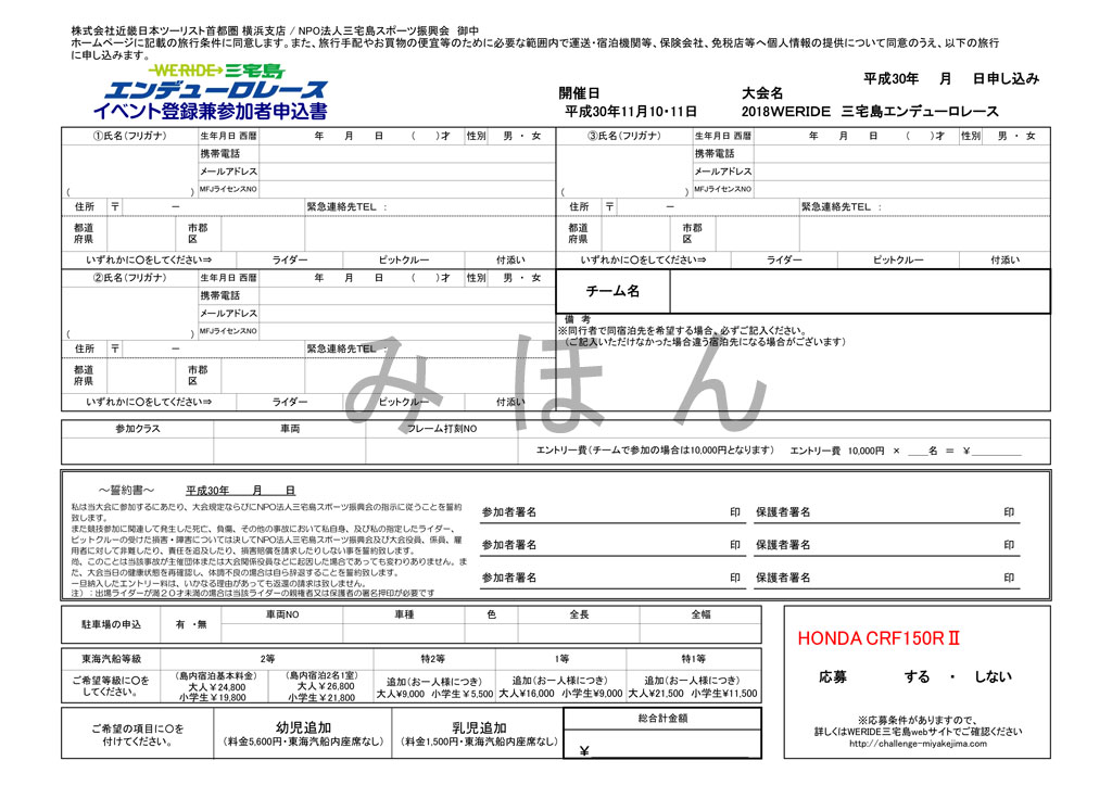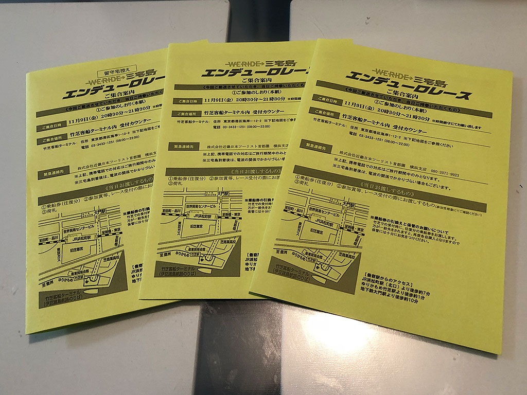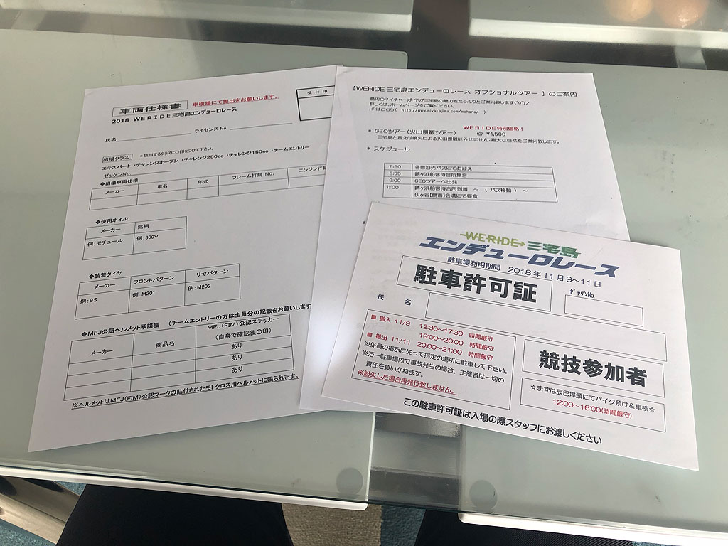 三宅島エンデューロに参加するのにまず必要なのが、MFJのライセンス。全日本MX選手権にもJECにも参加した事のない自分にとって縁のないライセンスなのですが、三宅島エンデューロは公的資金も入ってるせいか、MFJのルールに則って行われる関係か、MFJライセンスが必要です。といっても、エンジョイライセンスという3,350円のでOKです。MFJライセンスは、開催が発表になる随分前に取得しました。というのは、9月3日にサイトの方で開催発表があり、9月5日からエントリーが開始されたのですが、6日消印までのエントリーで枠がいっぱいになってしまい、開催発表が出てからライセンスを申請してたのでは、到底間に合わなかったからです。まぁ、これは結果論でしかないのですが、MFJライセンスがない事にはエントリー出来ませんので、参加を予定している人は、早めに取っておくのが肝要だと思います。