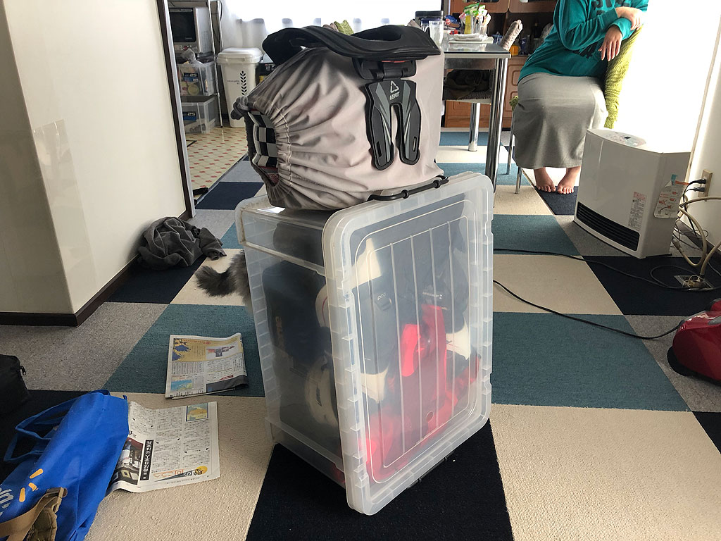 出発の前日になって、第二パドックに到着してからサイティングラップに向かうまで、装具を整える時間があるとの情報が入ったので、手荷物に梱包していたチェストプロテクターとエルボーガード、ネックサポートを外して、辰巳埠頭でメッシュボックスに入れる事にしました。