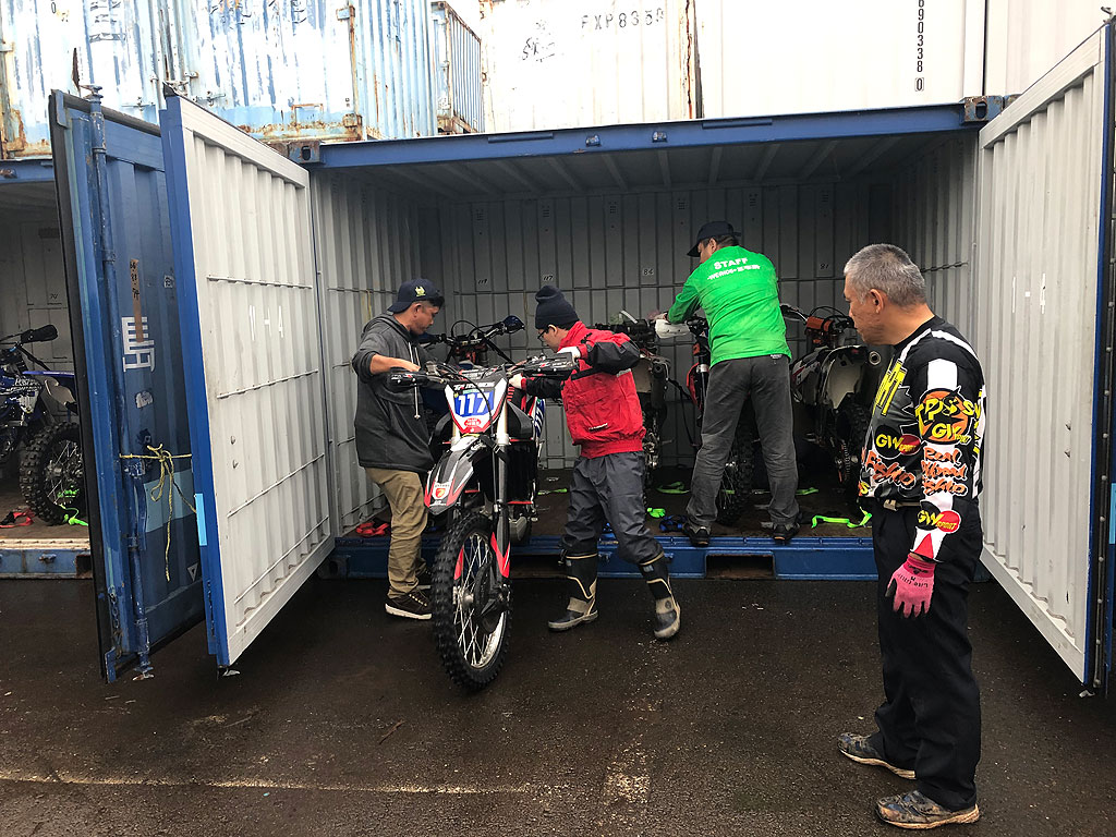 さて、いよいよ11月9日、出発です。初めての事なので、余裕をもって1300時に家を出発、高速使って1430時頃、辰巳埠頭に着きました。井の一番くらいかと思ってたら、既に多くのライダーが先に着いていて、バイク下ろしてました。まず、車両仕様書を持って受付を済ませ、バイクを下ろして車検を受けます。そしてバイクを押してコンテナまで運びます。コンテナには5台のバイクを積むのですが、固定位置にゼッケンの番号が書いてあり、そこに固定されます。ちなみに、自分のゲイレルル号はサイドスタンドがありますが、それがないモトクロッサーなどは、三角スタンドも持って行かなければなりません。