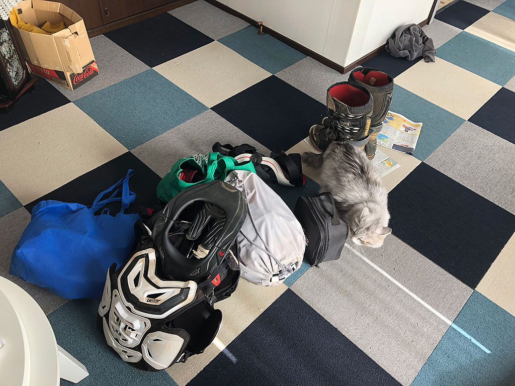 今回、何を一番頭を悩ませたといっても、装備の事でした。普通のレースなら、トランポで現地に駆け付けるので、要るものは全部積んで現地で向かえるのですが、今回はトランポは三宅島に持って行けません。つまり、要るものの大半は自分で運ばねばならないのです。スケジュールを確認すると、0830時に宿を出て、第一パドックでバイクを受け取り、そのまま自走でコースまで行き、そのままサイティングラップという流れになっています。つまり、宿を出る時点でコースを走れる状態になっておかねばならない、という事です。つまり、ウェア、ヘルメット、ニーブレース、ブーツ、チェストプロテクター、ウエストベルト、ネックサポート、エルボーガード、これら全てを梱包して、手荷物として持ち運ぶ必要がありました。その他に、着替え、GoProやハンディカムなどの装備も必要です。