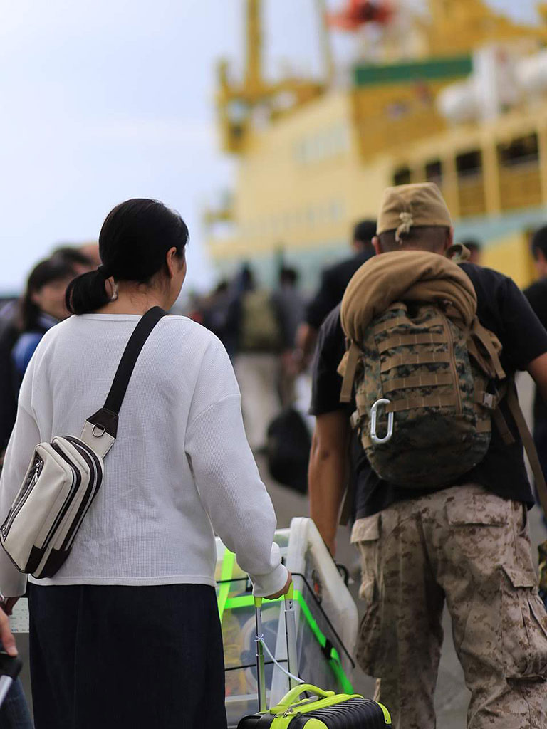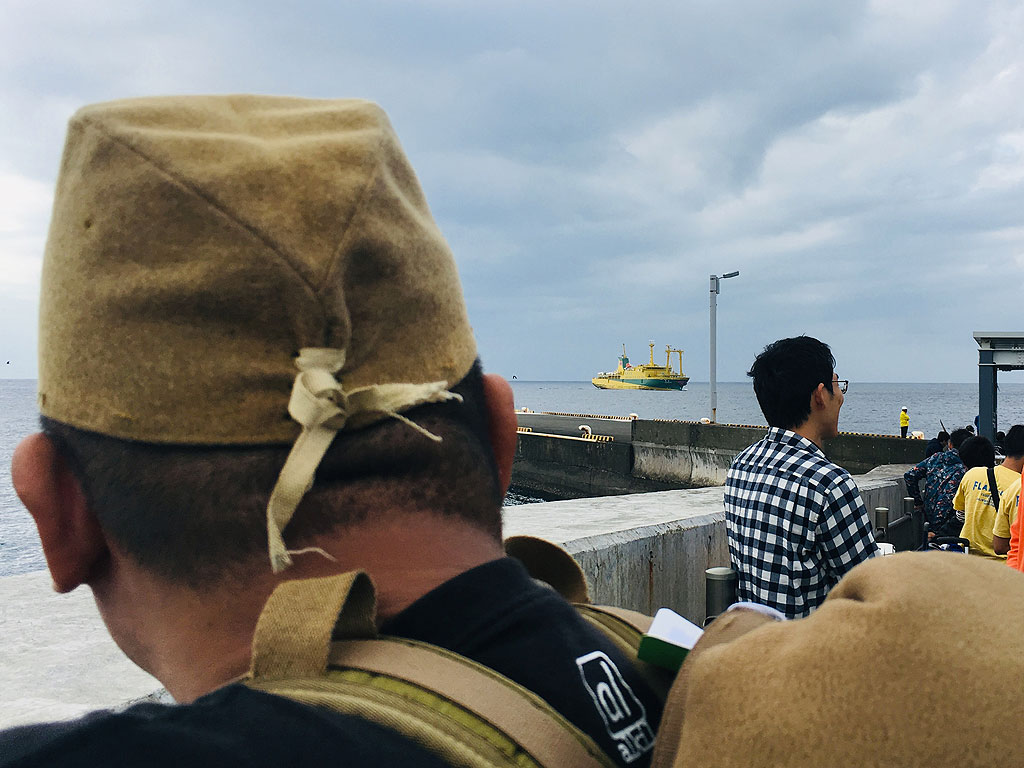 さて、荷物はどうするのか分からなかったのですが、宿には戻ってこないので、タクシーに積んで運んで貰いました。しかし、時間になって島市会場に集まってきた参加者を見ると、自分みたいに大荷物持ってきてる人は一人もいない。聞いたところ、宿から直接、港に運んで貰ったみたいです。ちなみに、オプショナルツアーだけでなく、独自でレンタルバイク借りてツーリングしたり、釣りに行ったりした人もいるのですが、それらの人は宿からバスか何かで島市会場まで移動したみたいです。