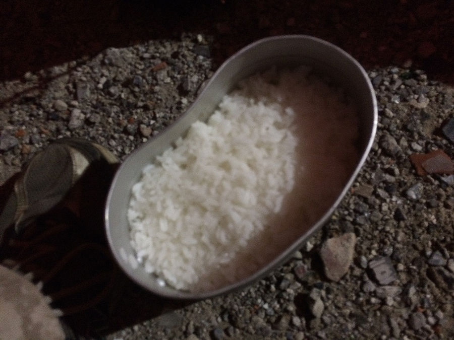 今回の教訓。炭や木などで飯を炊く場合は、やはりガンガン燃やしたくらいでないと、短い時間で沸騰させる事は難しい。火力が弱いと、それらの熱源であっても、アルコールストーブ同様、場合によってはそれより弱い火力となって、ロクな飯が炊けない。といった所ですが、まぁ、まだまだ経験が足りませんよねぇ。