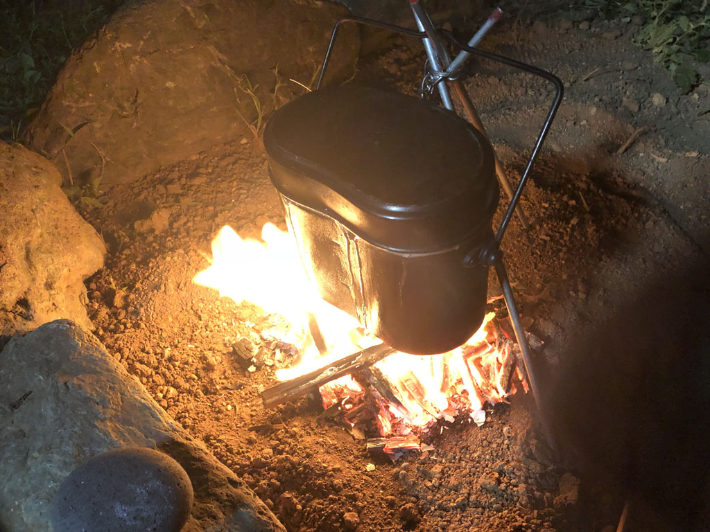 しかし、やはり場所は取るし、地面に直接炊き火する格好になるし、吹きさらしには違いないので、あまり使い勝手が良いとは言えません。ブッシュクラフトとしても、違う道具を使いたいところです。