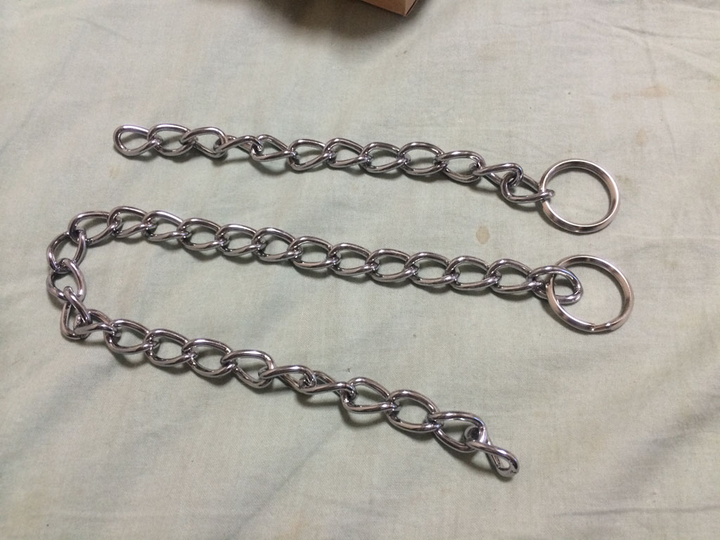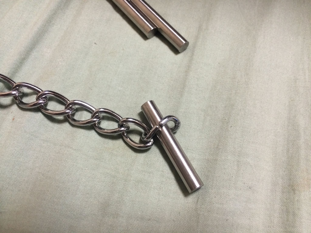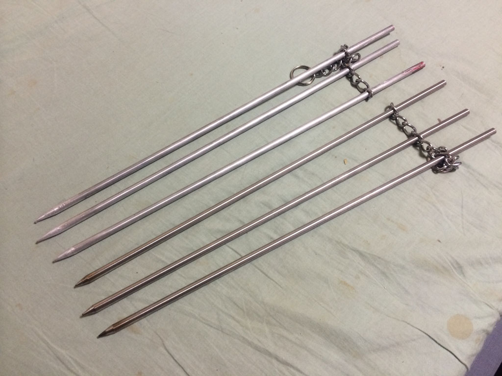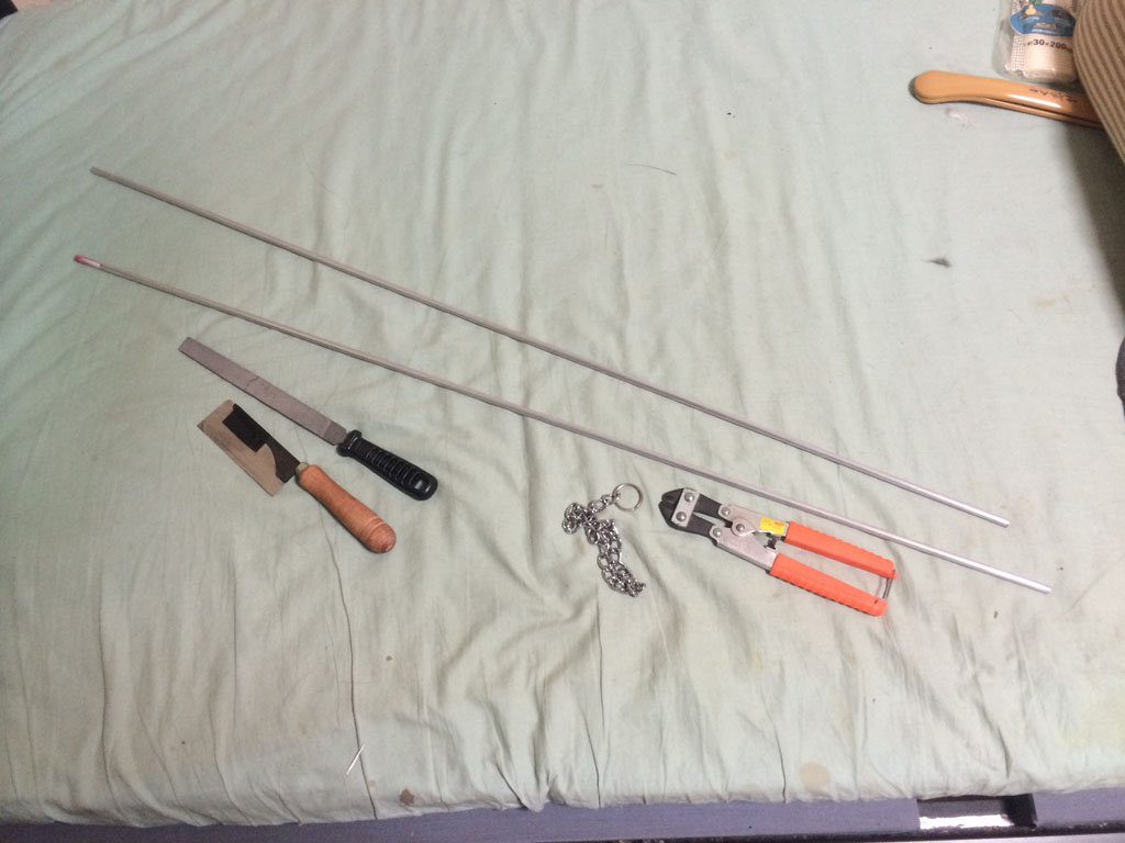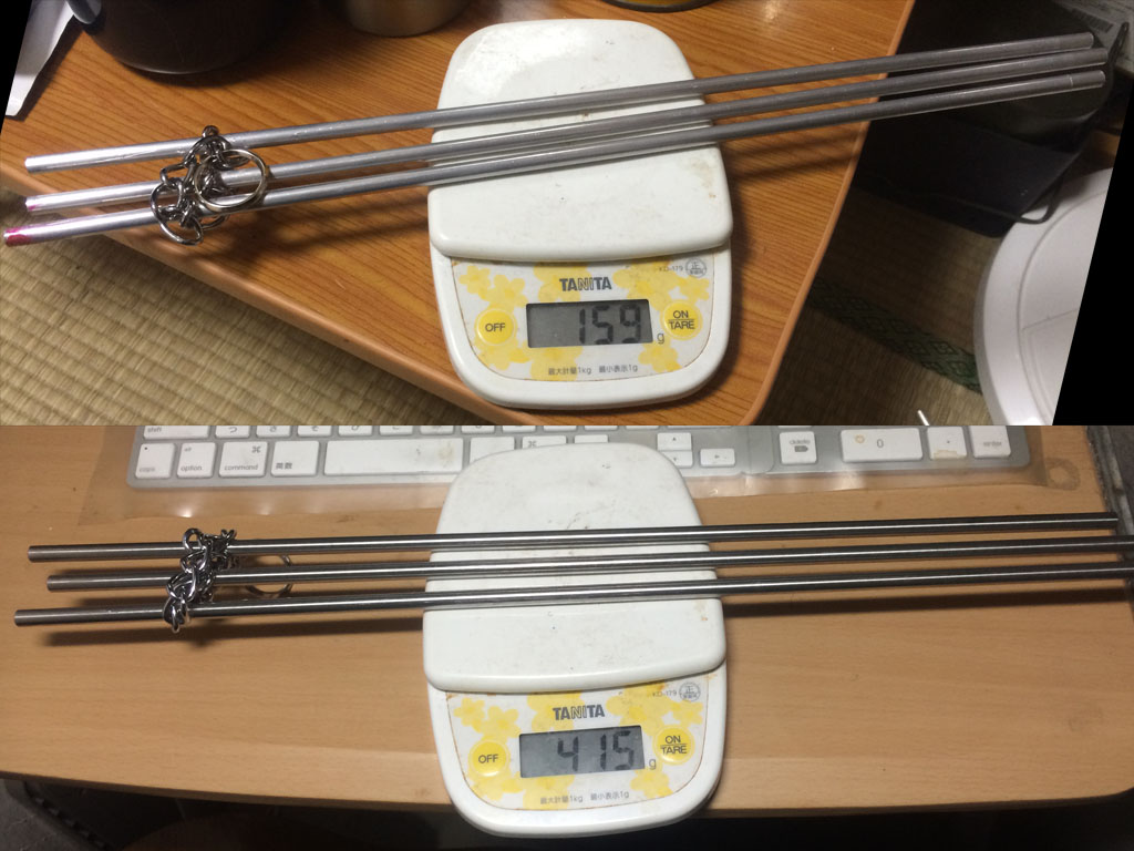 飯盒掛は上記史料に図面と寸法が記載されていますので、その気になれば誰でも作る事が出来ます。ただし、寸法が尺寸法なので、その単位での材料は売ってないので、ミリ単位で近似のものを買うより他ありません。寸法表によると、棒の長さは一尺四寸、太さは二分五厘とあります。この飯盒掛を政策した時点では、違う計算をしてしまって、長さ42cm、太さ7mmと計算していたのですが、正しい太さ8mm(正確には7.938mm)の様です。棒の材質はアルミという事で、ホームセンターで調達しました。また、3本のアルミ棒を連結するチェーンや輪っかは、まったく同じ物を再現するというのも無理なので、適当なチェーンやキーリングで代用する事としました。ところで、飯盒掛を作成する時点で、「焚き火で使うのにアルミ棒で大丈夫なのか?」という疑問があり、そこで別個にデラックス版という事でステンレス棒でも製作する事にしました。