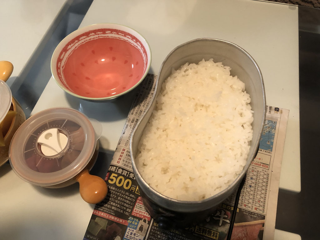 さて、実際に焚き火で使ってみたのですが、まず分からなかったのが、3本の足をどの程度の角度で開くのか、という事。地面には突き刺して使うのは前提としてなかったのでしょうが、庭の畑の土は全然しまってなくて、仕方なく5cmほど刺さざるを得ませんでした。ともあれ、飯盒の底と地面の隙間が10cmくらいになる様にセットしました。その後は、普通に焚き火をしたのですが、ファイヤーボックスよりも吹きさらしで効率が良くないのか、薪が白くなるほど燃え尽きず、炭になって積み重なる様で、次の薪を入れるのに難儀しました。まぁ、これが普通の焚き火なんでしょうが、後発のファイヤーボックスの優秀さを改めて感じました。何のかんので20分近くかかって、やっとこさ炊き上がったのですが、出来映えは意外にも中の上くらいの出来映えでした。察するに、飯盒の下半分全体に火が当たり、いい感じに熱が加わったからでしょう。