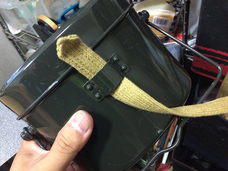 中国製飯盒の一番の特徴は、革通しがない事ですが、この飯盒が海外のサイトなどで「WW2 Japanese Imperial Army Messkit」と称して売られているのを見かけます。海外の日本兵マニアのリエナクターが、一体どうやって背嚢に縛着するのか興味のあるところです。一般の人は、縛着する機会は滅多にないと思うのですが、当協会では輸送中に蓋が開いたりしない様に、革通しにナイロンのストラップなどを通して蓋を固定したり、バックパックに上手い事付けたりするのを勧めています。あればあったで使い出はありますし、やっぱり雰囲気も大事だと思うので、上記の国産飯盒をお勧めします。