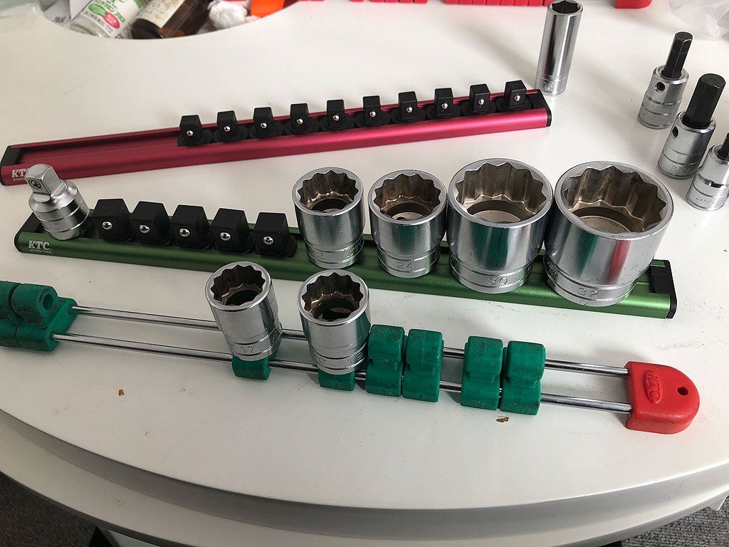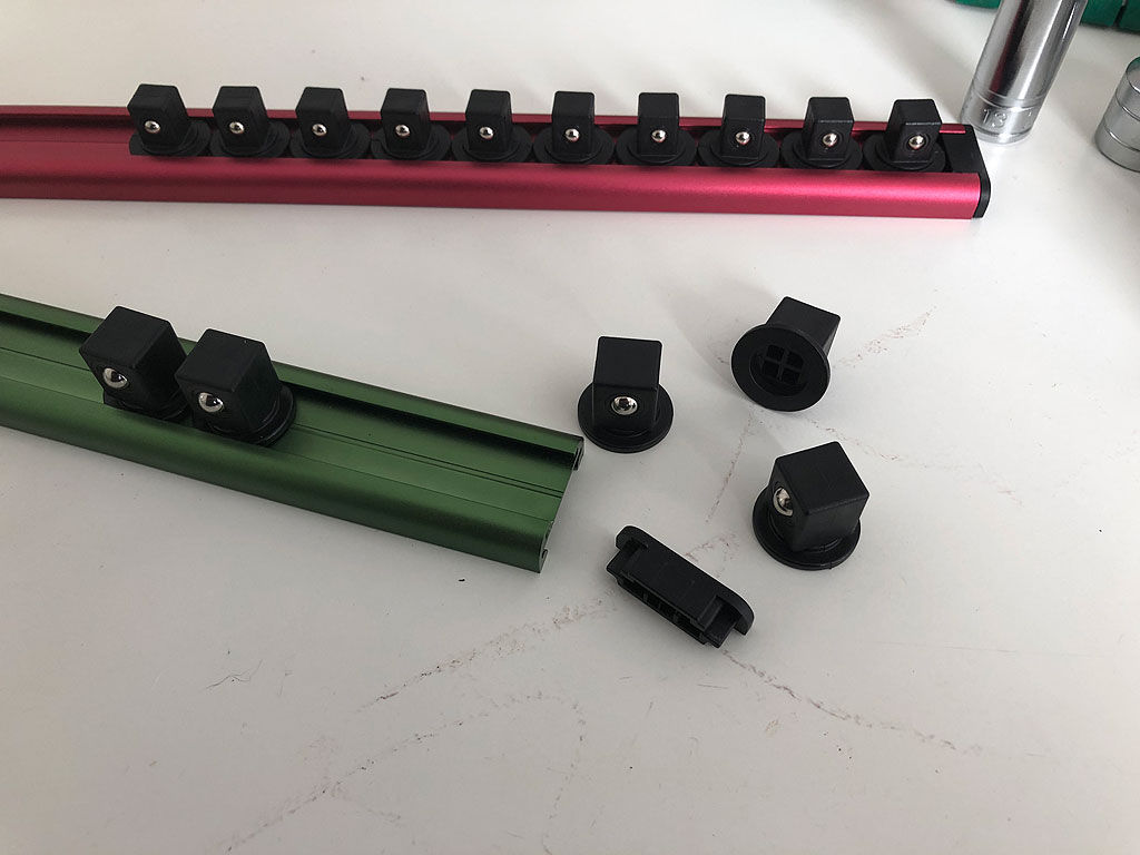 ソケットの数が増えてから、ソケットホルダーはEHB315(9.5sq用)とEHD410(12.7sq用)を使っていましたが、クリップが樹脂製だけに経年劣化で緩くなってきた事と、エンドストッパーのネジをいくら締めても抜けてしまう事が多く、そろそろ買い替えかなぁ、と感じていました。そこで今回、若干高めですが、アルミソケットホルダーのEHBA310(9.5sq用)とEHBA410(12.7sq用)を買いました。