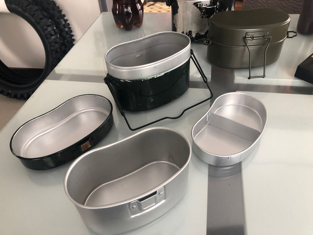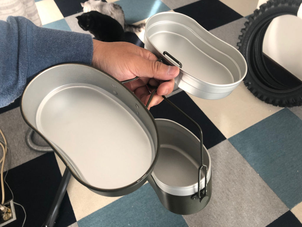 飯盒それ自体は、そもそもは煮炊きの為の鍋釜として開発されたのは疑い様も無いのですが、軍隊の野戦での給与のあり方が変化していって、次第に食器としての需要が高まって行ったのは、飯ごう2型の姿形から、十分に推測する事が出来ます。飯盒は、鍋釜なのか食器なのか、それは運用する側の事情によって異なってくると思います。自分は、飯盒はあくまで飯を炊くのが主目的であって、食器としての活用は、片手鍋でラーメン煮てそのまま食べるのと同様の位置づけでありますので、より食器よりに作られた飯ごう2型は、飯盒としては役不足に感じています。その一方で、ソロクッカーとして見た時、4合炊きの兵式飯盒は確かに容量オーバーであるのも認められるところです。