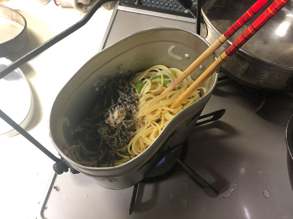 具材が炒まったタイミングを見計らって、茹でたスパゲティと塩昆布を投入し、よくかき混ぜながら炒めます。ぶっちゃけた話し、この手の作業は飯盒は苦手で、フライパンでやった方がよっぽどやり易いのですが、フライパン買うお金がない貧乏な人に向けて、あえて飯盒だけでやりました。やりにくいだけで、やれない訳ではありません。
