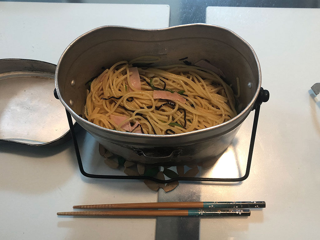 パスタ、というか、自分の年代ではスパゲティなんですが、洋麺の代表格にして一般家庭においても、また独身者においても、さらに言えば貧困者にとっても、ポピュラーな食材です。一般的には鍋で湯がいて、ザルで湯切りして、ミートソースかけたりプライパンで炒めたり、という料理の仕方になるのですが、日本飯盒協会はあくまで飯盒の協会ですので、あえて「飯盒しかなかった場合」を想定して調理しました。