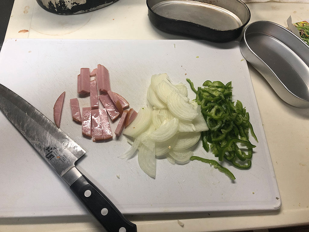 余談はさておき、まず具材を切ります。使う対象が麺ですので、今回は細切りにします。スライサーを使う手もあるのですが、あまり細すぎると炒めた時にフニャフニャになるので、その辺りはお好みで。今回は大体2〜3ミリくらいにしました。ちなみに、「包丁なかったらどうするんですか?」みたいな事も言われたのですが、その場合は、ハサミでもカッターナイフでも良いから、代用します。自分はアウトドアではまず包丁は使いません。ハサミが最強です。