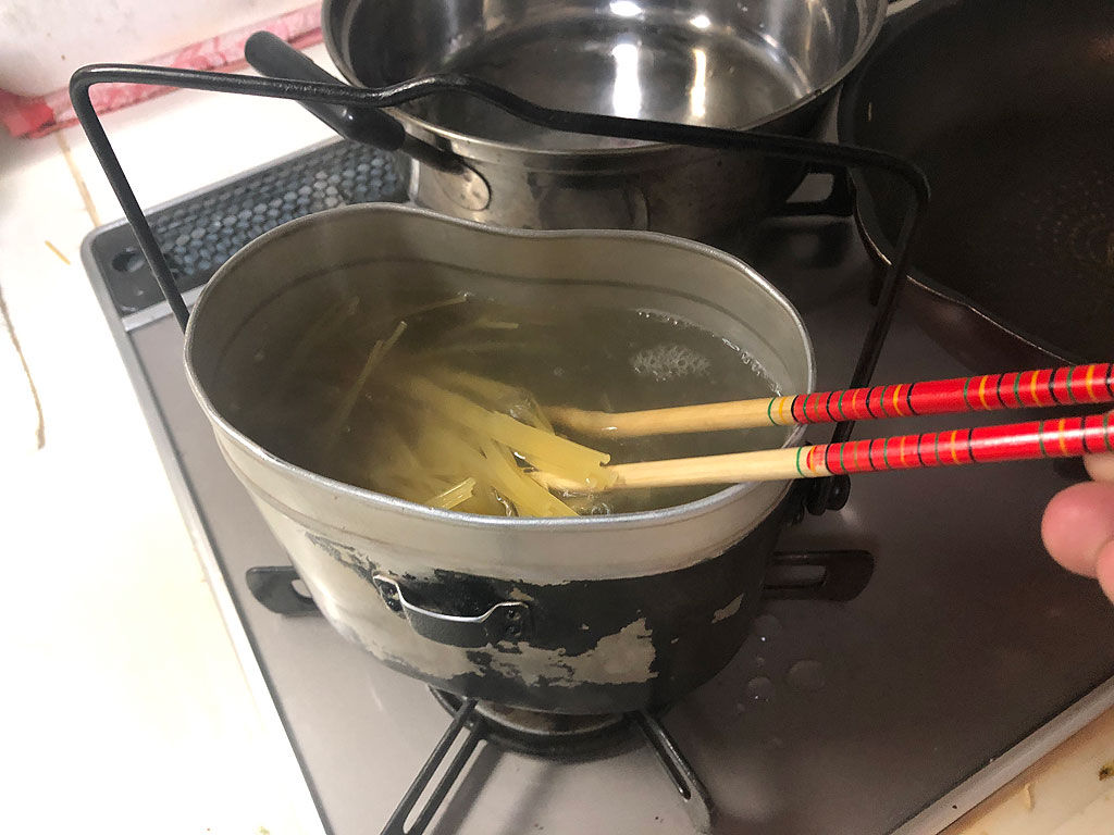 次にスパゲティを茹でます。茹で方はスパゲティの袋に書いてあると思いますが、あえて注意するとしたら、長いまま飯盒にぶち込むよりは、半分に折って入れた方が茹でやすいかな。あと、後で炒める時もかき混ぜ易いと思います。まぁ、長いのをアア〜〜ン、ズルズルと食べたい人もいるでしょうから、その辺りはお好みで。