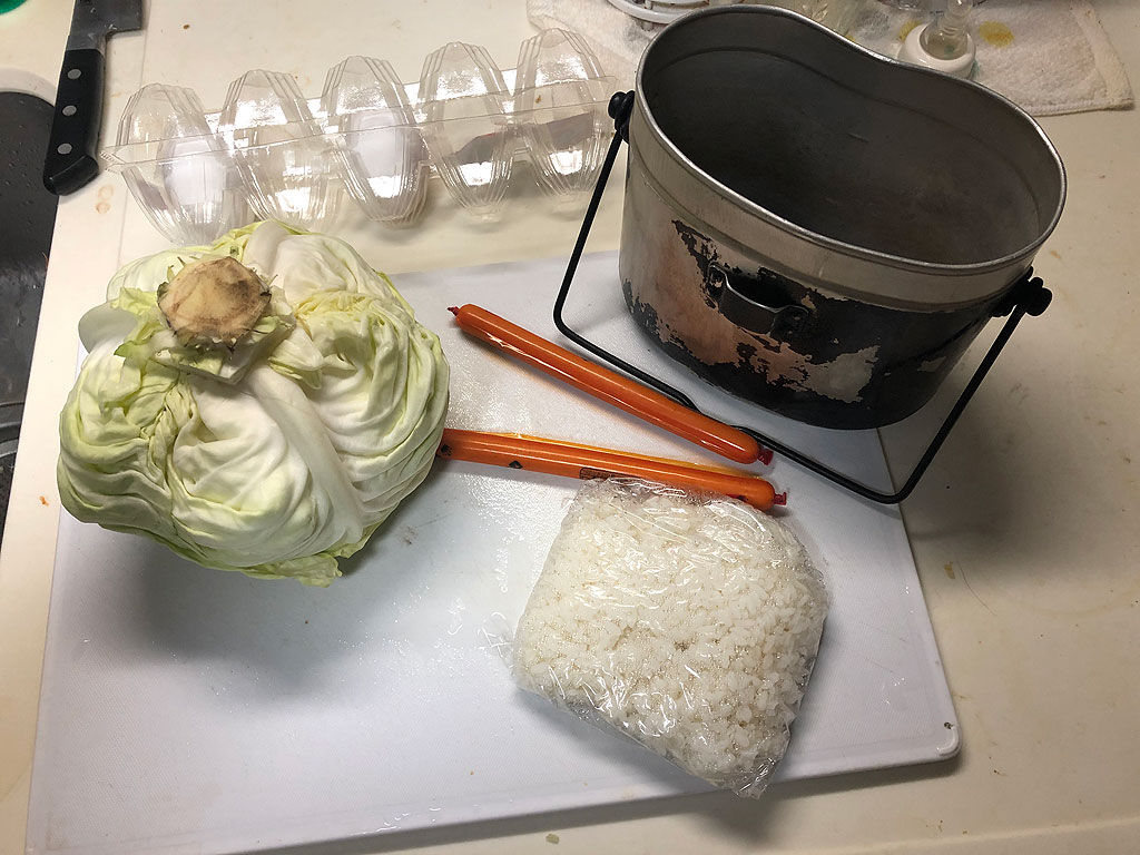 今回も使うのはキャベツ。キャベツは安いですし、色んな料理に使えますし、実に便利です。分量はご飯と同じくらいの量で。ご飯より多いと、流石に野菜炒めにご飯が混じってる様なカテ飯状態になって、それはそれで何だかなー、といった感じになります。ちなみにご飯の量ですが、飯盒の中でかき混ぜる事も考慮して、多くても2合分くらいに留めておくのが良かろうと思います。まぁ、冷や飯になるのは残ったご飯でしょうから、そうそう多くもないでしょう。