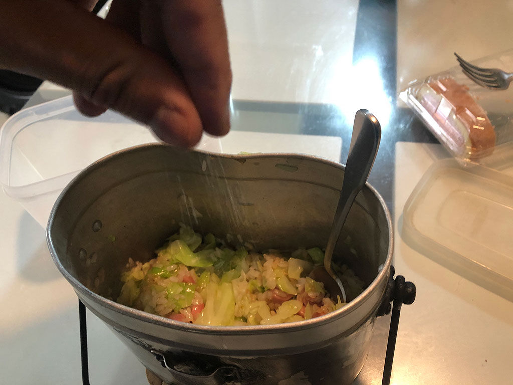 ちなみに、炊飯器と違って飯盒には保温機能は当然ありません。となると、余ったご飯はもれなく冷や飯になります。冷や飯だって、色んな食べ方があるのですが、あえて今回は飯盒で焼き飯と言う訳です。