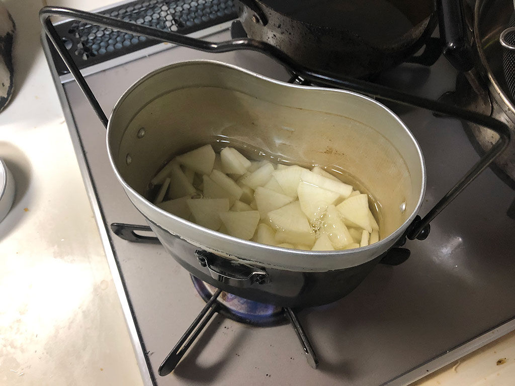 大根飯は、その名の通り、大根がメインのおかずです。軍隊調理法によると、野外調理兼用と書かれているのですが、つまり兵営の炊事だけじゃなくて、演習や野戦といった状況でも作れる、言って見れば簡単な料理という事です。実際にめっさ簡単です。