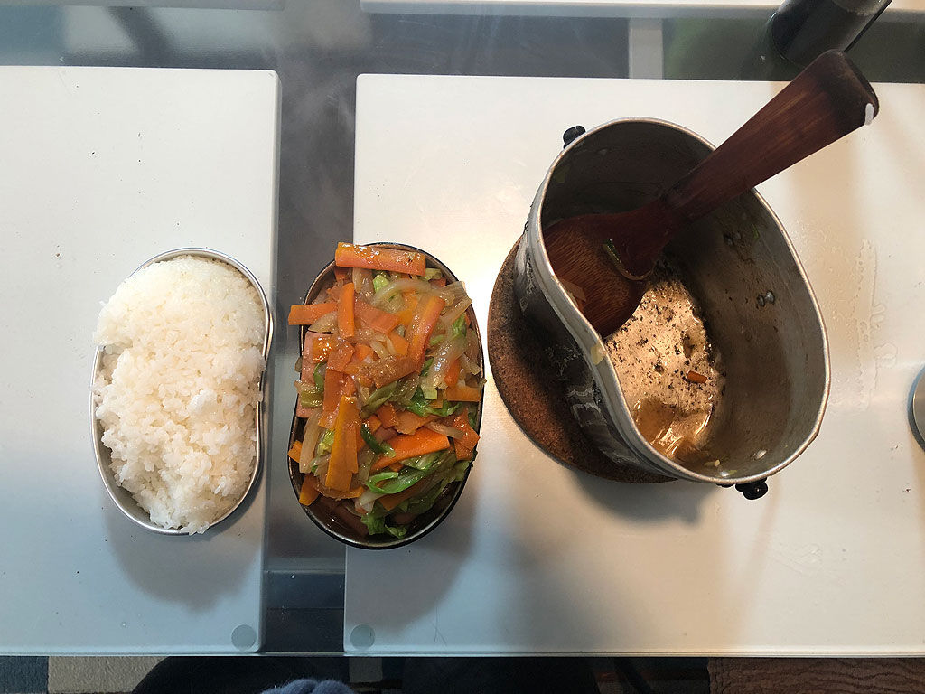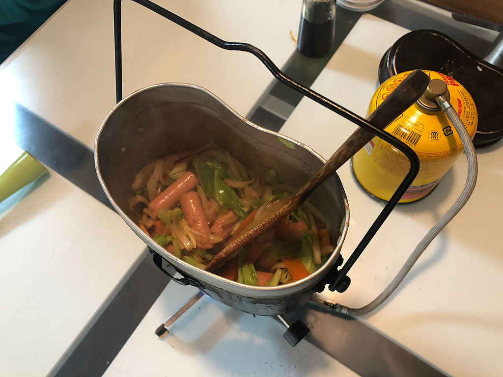飯盒で炒め物を作れる、というのを知らない人が結構いるのですが(飯盒はご飯を炊く道具という固定観念がある)、スパゲティを炒めたり、焼き飯を作ったりする事も出来ます。となれば、野菜炒めなどはお手のものなのですが、問題は「飯盒が一つしかない時に、野菜炒め作ったら飯が炊けんではないか」という事。今回はこの問題に取り組みます。