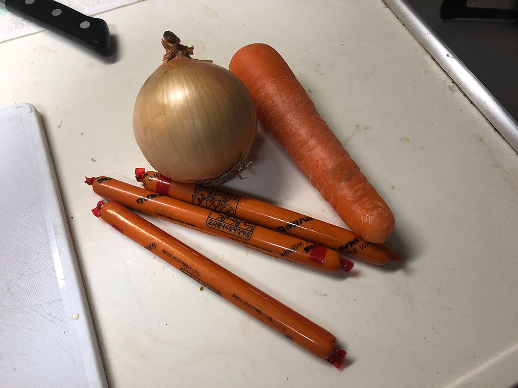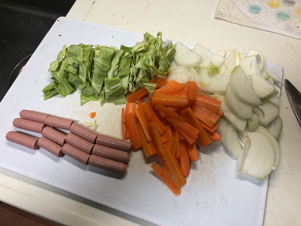 調理器具が一つしかなくて、二つの仕事をするとなると、順番という事になります。飯を先に炊くか、おかずを先にやるか。まぁ、どっちが先でもいい様なもんですが、いずれにしても、先に出来た方は時間とともに冷めていく事になりますので、熱々ご飯を優先したい人は、ご飯をあとで炊くのも可です。今回は飯を先にしました。