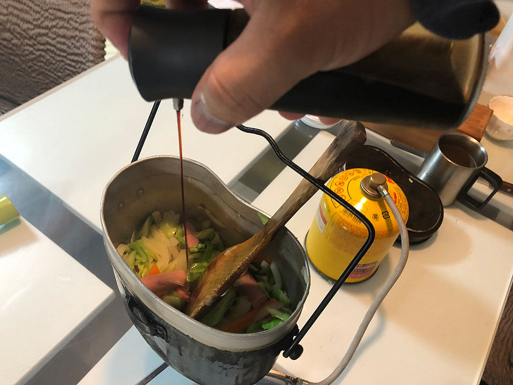 野菜炒めが出来たら、そのまま飯盒から直接食べても良いのですが、もし蓋なり掛子なりが空いているのなら、そっちに移し替えた方が食べやすいのは言うまでもありません。すると飯盒本体が空きますが、もし汁物が欲しかったら、空いた飯盒で作れば良い訳です。そうすれば、油も落ちて後で洗う時に多少は楽というものです。もっとも野菜炒めの後ですから、まぁ油も残ってたりする訳で、そういうのを気にする人には無理ですが。
