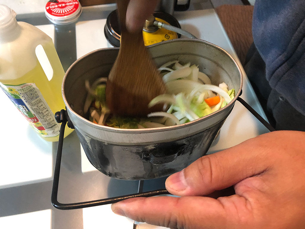 飯は普通に炊きます。お一人様という事で、2合炊くと想定していますが、2合分なら出来た飯を掛子や蓋に盛って置いておく事が出来ます。飯を炊いたあとの飯盒は、出来れば洗った方が良いのですが、独身者がそんな手間の要る事をするとは思えないので、飯を移した直後から野菜炒めに取り掛かります。注意する点は、出来るだけ飯やおねばはキレイにこそげ取る事。焦げ付き防止のためです。
