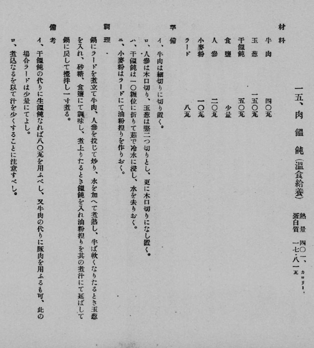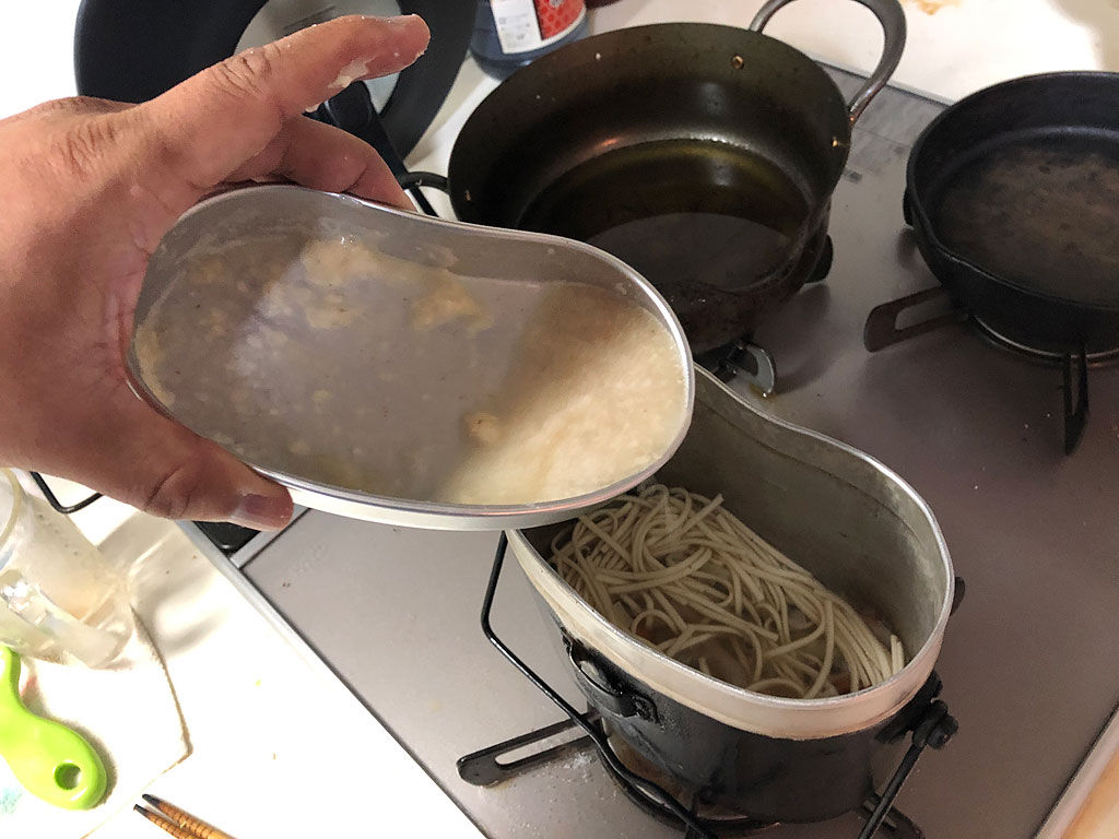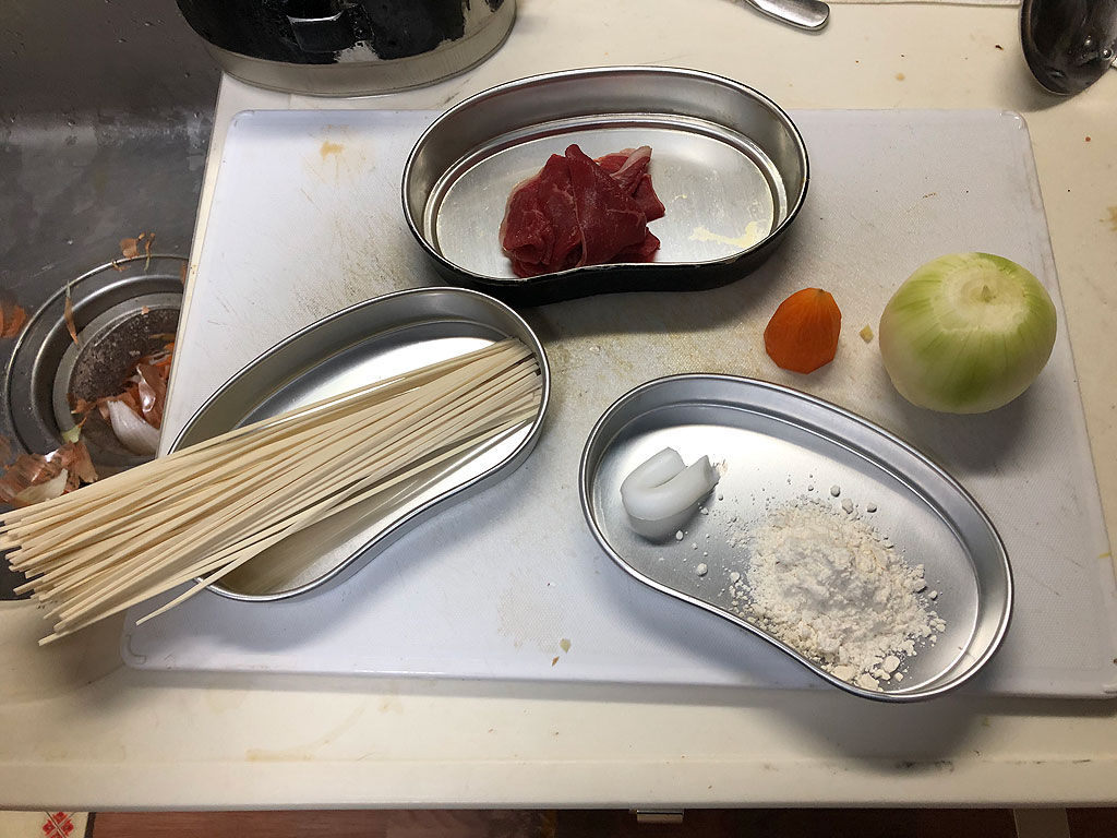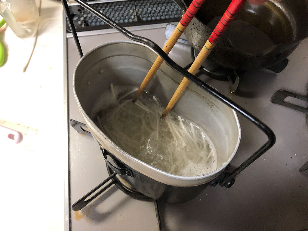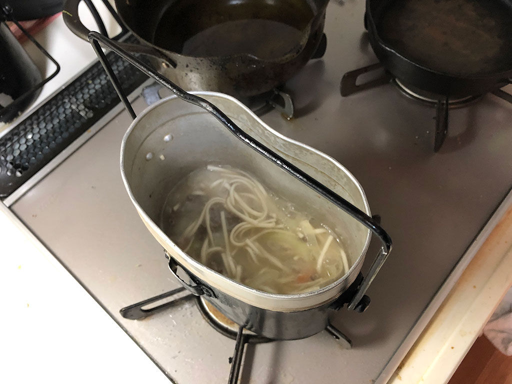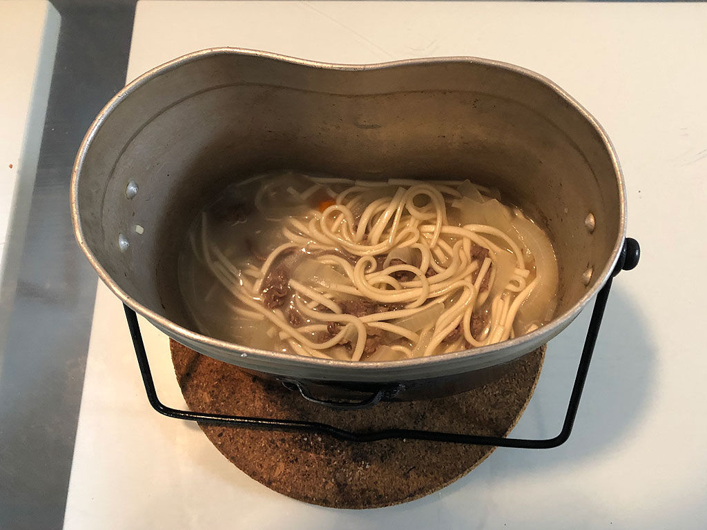 飯盒はご飯を炊く炊事道具ですが、麺を煮るのも得意です。そこで今回はウドンを作る事にしました。軍隊調理法の第三の煮物に収められている一五の肉饂飩です。檸檬と同様に饂飩も書けと言われたら書きにくいですよね。ウドンって麺類ですけど、軍隊調理法では煮物に分類されています。さらには「温食給養」と書かれています。寒い時に給与されるみたいです。