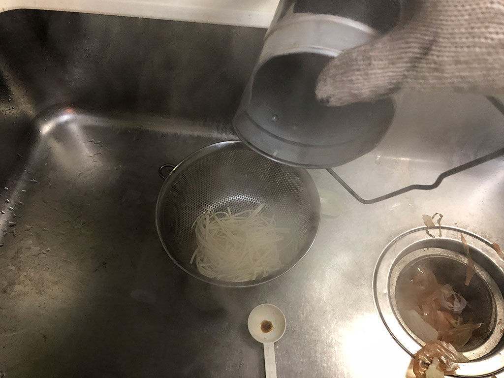 ウドンはザルに空けて、水で締めます