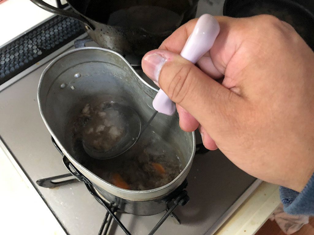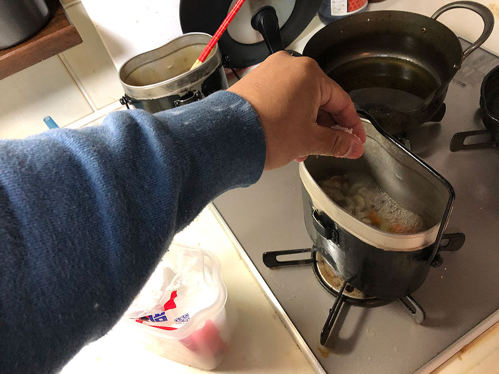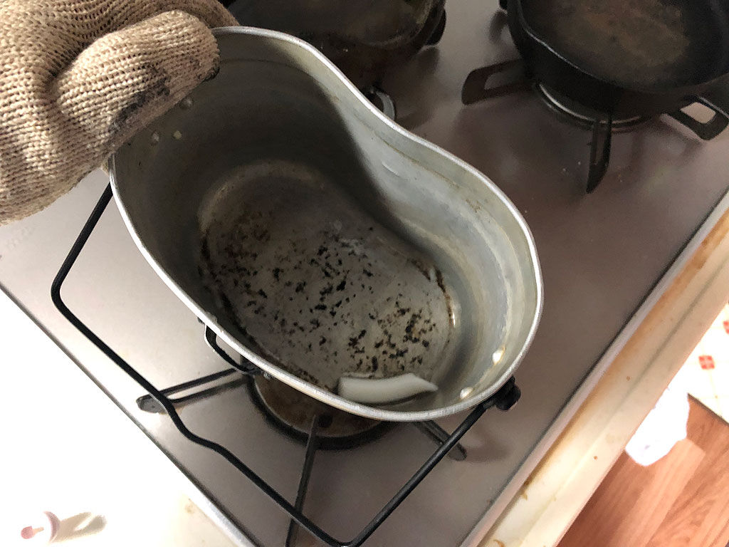 まず飯盒にラードを煮立てます
