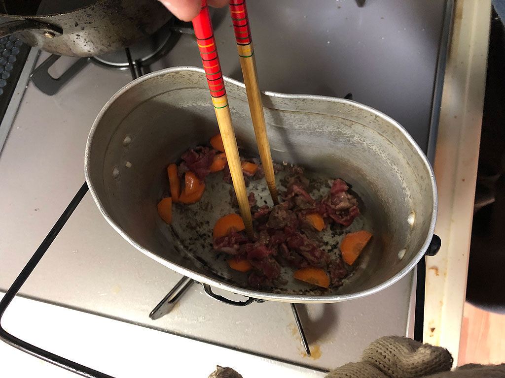 牛肉と人参を炒めたあと、水を入れて煮るのですが、この水の量が書いてありません。軍隊調理法の特徴であると思うのですが、意外と水の量が書いてないレシピが多いのです。あまり入れすぎたら薄くなるでしょうし、少なめだと汁気が足りなくなります。良い感じにやれという事でしょうか。