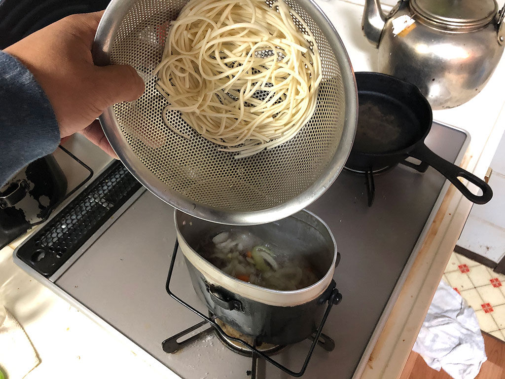 良い感じに玉ねぎが透き通ったらウドンを入れます