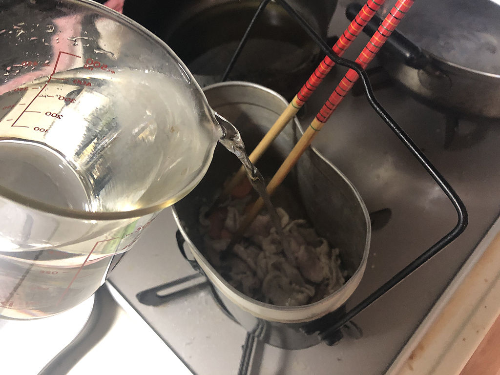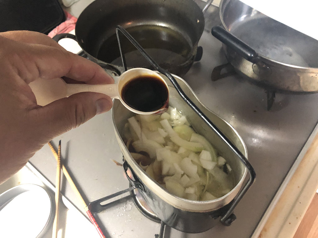 まず、たっぷりのお湯で干うどんを湯がき、ザルで湯を越して冷水で締めます。次に飯盒で油を熱して、肉と人参を炒めます。次に水を入れるのですが、今回は水の分量が書いてありました。一人分270ミリリットルです。続いて玉ねぎを投入し、調味料として醤油30ミリリットル、砂糖2グラムを入れます。砂糖は好みによって入れると書いてありました。この様にちゃんと分量が書いてあると、手探りで味つけしなくても良いので、より正確に当時の味を再現する事が出来ます。