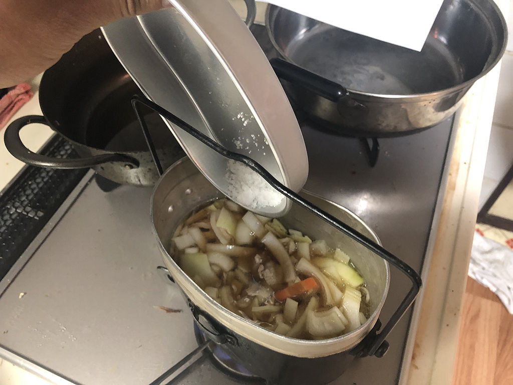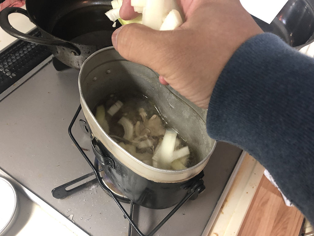 いい感じに玉ねぎに火が通ったら、茹でたうどんを飯盒に入れてかき混ぜ、ちょっと煮込んだら出来上がりです。前回の肉饂飩と比べると、今回は玉ねぎと醤油の甘辛い香りがして、食欲をそそられます。