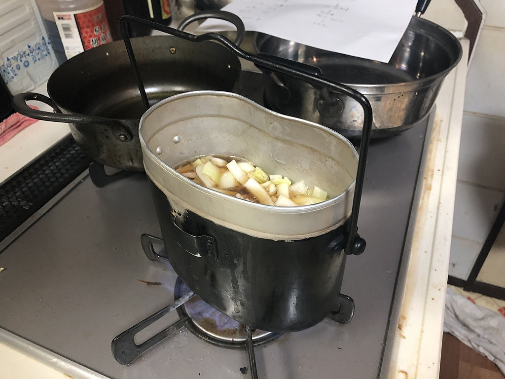 今度の肉うどん汁は、具こそ玉ねぎだの人参だのですが、今のうどんに近いものが出来ました。肉饂飩もそうですが、軍隊調理法では出汁の入った麺つゆを使わないのが特徴ですが、これはこれで十分美味しく感じました。