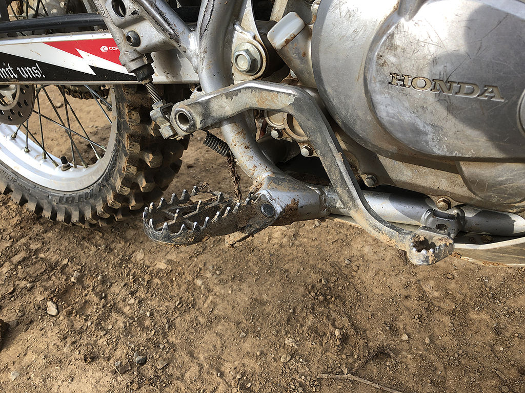 実は先週、成田に来たのですが、ドライだと思ってら前の晩に雨が降ったとかで結構湿っていて、しかもその時はまだトライアルタイヤでしたので、無理せず撤収。タイヤをAT81に履き替えました。本当はVE33S“甘夏”を使いたいところですが、XR230のスイングアームは短くて、トライアルタイヤでもマッドガードを擦って壊してしまいます。仕方なしに、100/100-18のAT81を履くしかない、という訳です。