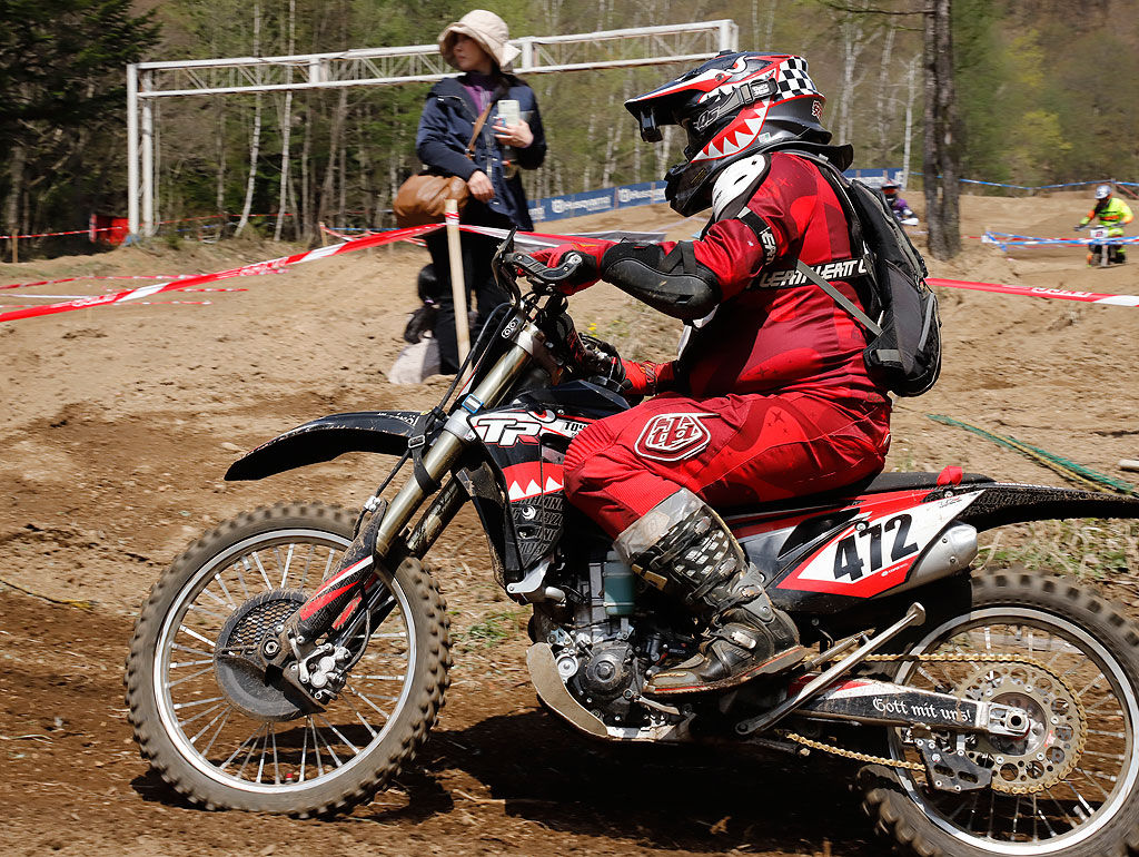 前回のGAIAはXR230“パンツァーファウスト号”で参戦したのですが、その時の印象は、とにかく「ダラ〜〜ん、ダラ〜ん」とした走りで加速感が乏しく、前に進むのにパワー食う様な感じでした。今回のCRF450RX“ゲイレルル号”は、流石は450で、ちょっとアクセル開けたら背中押してくれる様な感じで、前に進むのが楽。決して軽いバイクではないのですが、エンジンが強力なお陰で、登坂や加速ポイントで楽出来ました。