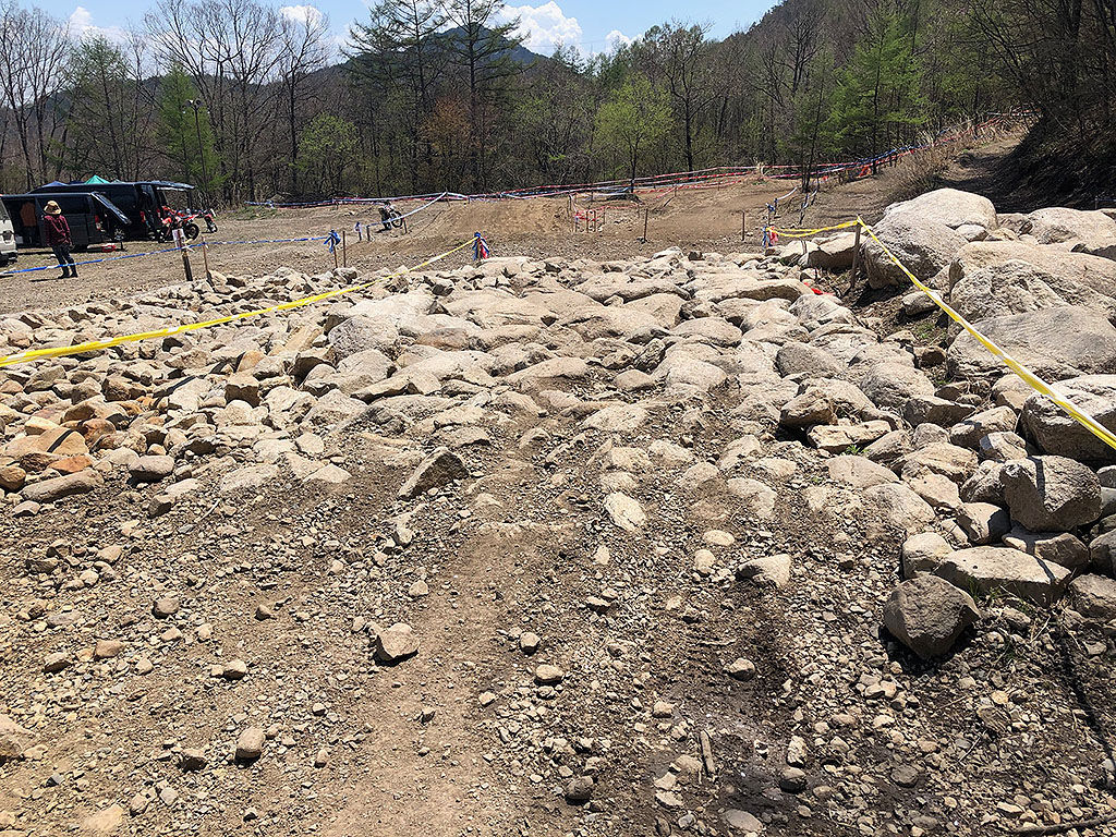 ロックセクションは第1パドックの目立つ所にあります。40ミニッツ、90ミニッツ、120ミニッツの3種類があり、自分は90ミニッツなのですが、ぱっと見た目、「やれそうでもあり、やれなさそうでもあり」と言った感じ。岩ゴツゴツの120ミニッツは論外として、石が小さくてもゴロゴロ動く40ミニッツに比べれば、石が締まった90ミニッツはまだしも突破し易そうです。が、こうしたセクションは苦手中の苦手で、爺ヶ岳のロックンロールリバーでも徐行以上の速度で走破しきれた事はありません。しかも、転けたら結構痛そうです。怪我は一切出来ない身の上なので、練習でもやった事ないセクションを本番でやるのはどうなのよ?という考えが頭から離れません。エスケープはあるのですが、それなりに距離があって、たっぷり30〜40秒はロスが出そうです。