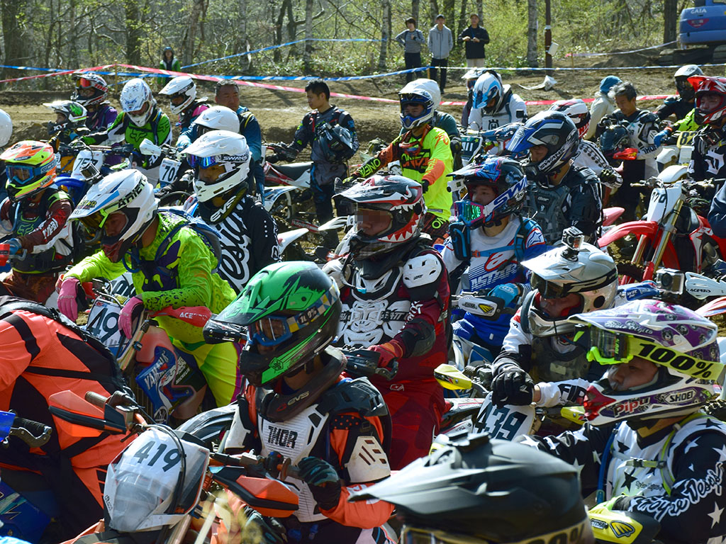 90ミニッツの出走は0815時から。総勢160台余が順々に出走していく様は、いつも壮観に感じます。この出走の場面がいつも仄かな緊張感があって好きです。もっとも走り出したらそれどころでなく、前の転けたのに巻き込まれない様に、かつ自分自身も安全に、確実に走る事に専念します。MXコースからGAIAウッズを抜けて、いよいよロックセクションへ。この直前まで、ロックを行くか迷っていたのですが、自信のない事は止める事にしてエスケープへ。エスケープはそこそこタイトなコーナーが連続するのですが、CRFの旋回性に優れた特性を活かして楽にクリア。続いてジェラシックパークへ。案の定、昨日下見の時に「渋滞しそうだ」と思ってた右登り坂が既にえらい感じになってましたが、とりあえず1周目は下見で歩いた一番右のラインをゴリゴリ突破。でも次からはライン変えないとダメだろうな、と思いました。その後はまぁ、慎重に進んだりアクセル開けたりと、いい感じに走りました。