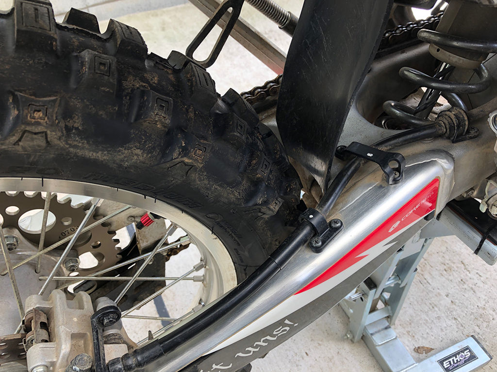 そもそもCRF250R(X)“モルゲンシュテルン号”では前13丁、後52丁にしてたのを、どうして51丁にしたのか、今となっては思い出せないのですが、なんとなく「モトクロッサーの2丁増やし」みたいなイメージを持っていて、CRF450Rは49丁なので2丁増やしの51丁にしたのかもしれません。ちょびっと足らん感じは、この1丁分だったのだと思います。幸い、増えたのが1丁分でしたので、チェーンは116コマのママで足り、アジャスターだけ調整し直しました。