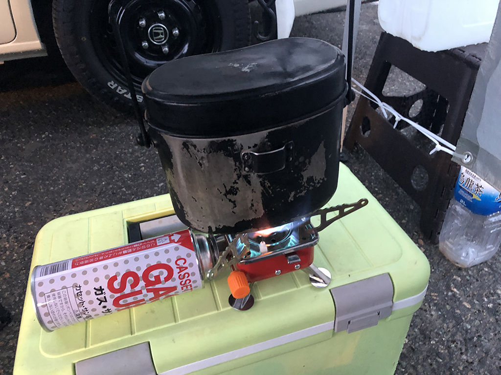 今回は、隊員の一人が中華製のガスストーブを持ってきました。2000円くらいで売ってるやつで、五徳が大きくしっかりしてるのが特徴です。ただし、バーナーが小さめなので、飯盒炊飯という観点では、熱の回りにやや難があるのですが、せっかく持って来たのだし、今回はこれで炊飯しました。(自分のプリムスIP-2243を出したり片付けたりするのが面倒だったのもあるw)