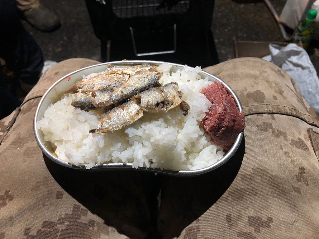 最近、仲間内ではは、日本飯盒協会の影響が徐々に浸透してきており、飯盒メシに合う野外向けの副食は何か、というトライアルがよく行われます。また、それまでオイルサーディンやコンビーフを苦手としていた隊員が、改めてチャレンジして、意外にもそれらが「食える」ものである事を再認識したりする事もまま行われています。