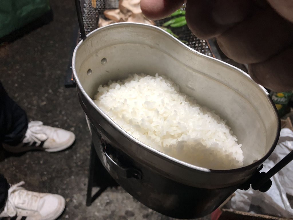 レースの前夜祭では、飯盒でメシを炊くのが定番となってきました。今回のWEX神立戦でも飯盒メシを投入。今回は5人参加という事で、3合炊く事にしました。
