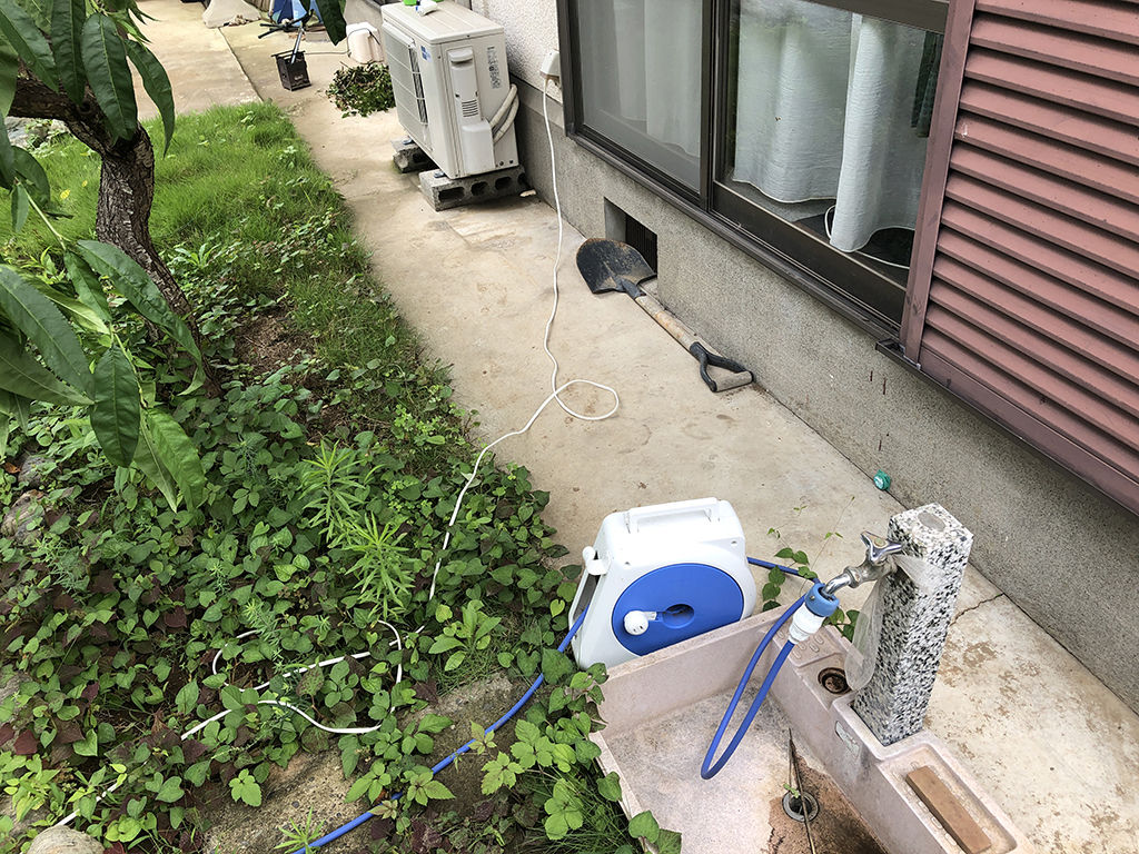庭の水道と外壁から電源を取ります
